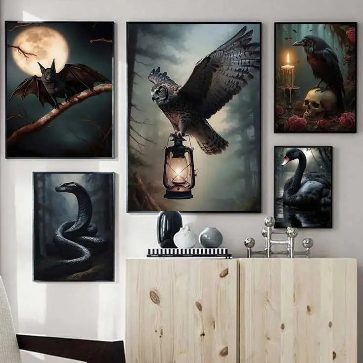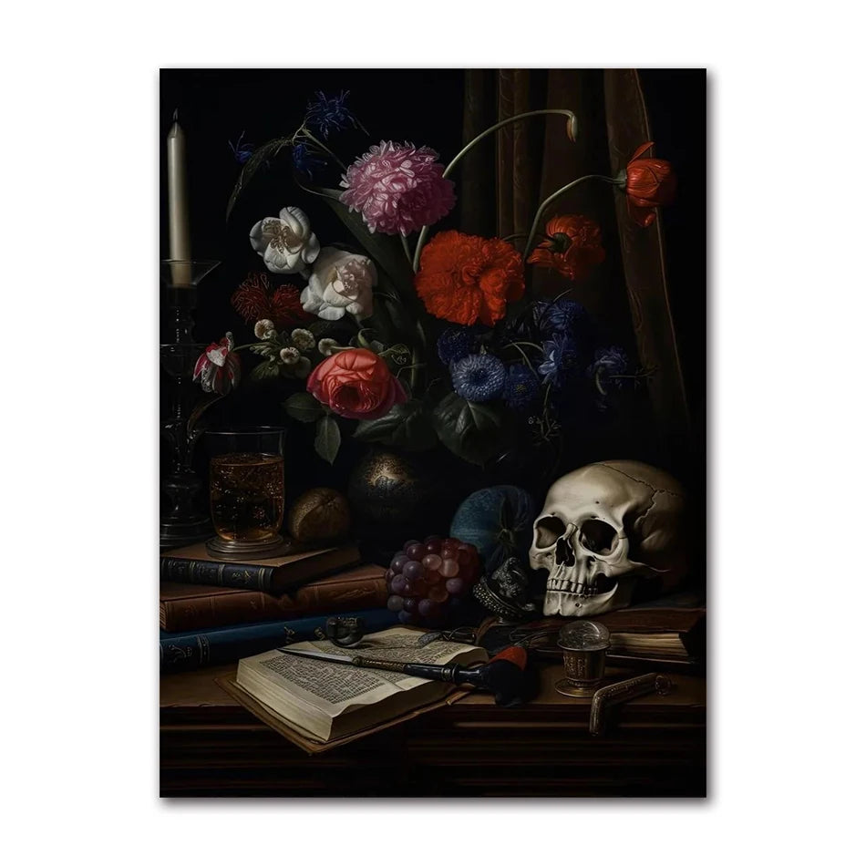 A unified ensemble, forming a spectral gathering where elements of nature, mortality, romance, and omen intermingle in a macabre fellowship where decay, love, and mystery coalesce into a silent, haunting symposium on the human soul's enduring enigmas.