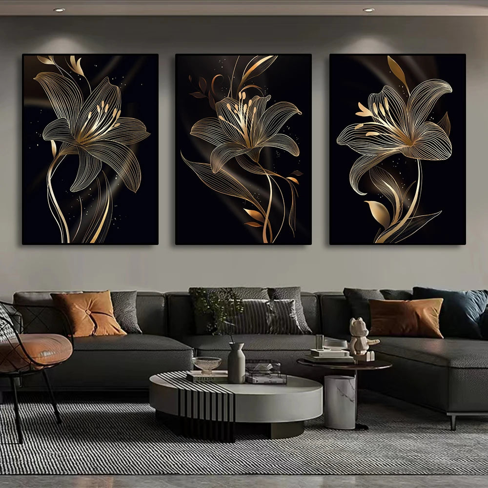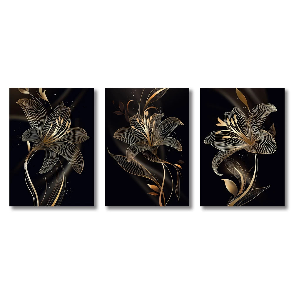 This quartet of luminous floral artworks captures the essence of eternal romance, with roses, lilies, tulips, and magnolias delicately outlined in radiant gold against velvety black voids—whispering tales of hidden desires, tender elegance, and the glowing allure of love's unspoken mysteries.
